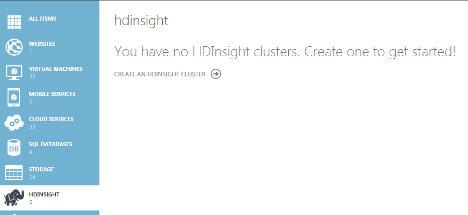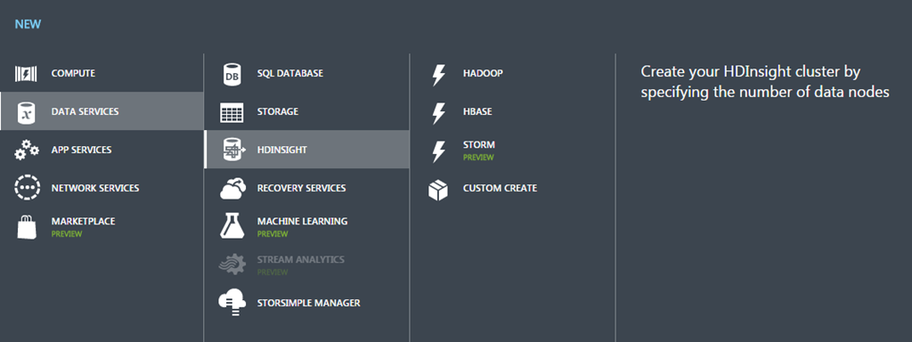 You can use one of the quick ways to create a Hadoop, HBase or Storm cluster, or you can click on Custom Create link to do it step by step:
