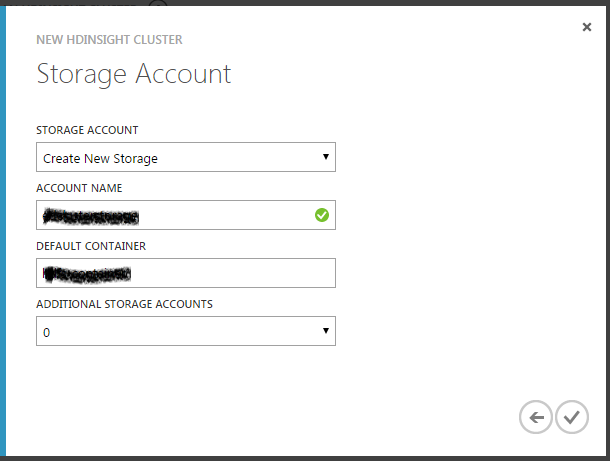 Now you can choice an existing Storage Account or you can create a new one, like we will use an hdfs file system, I prefer to create a new storage account that just will be used for my clusters. On Account Name type the name of the new storage account, and the name of the container to create. You can add additional storage accounts if you want.