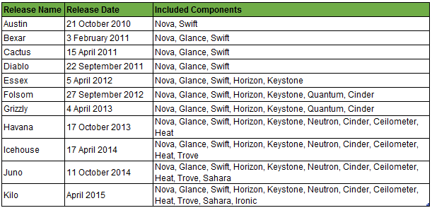 OpenStack had a new release each 6 months, each new version includes new compoments and each one has an original name. Current version is Juno and the next one will be deployed on April 2015 with the name of Kilo.