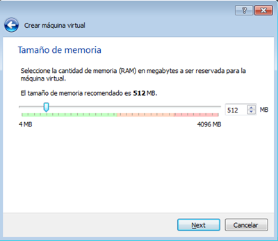 Dale un nombre y elige el tipo, después pulsa en Next y selecciona la cantidad de memoria (de la que dispone tu sistema Windows) quieres asignar a la nueva máquina virtual Linux: