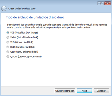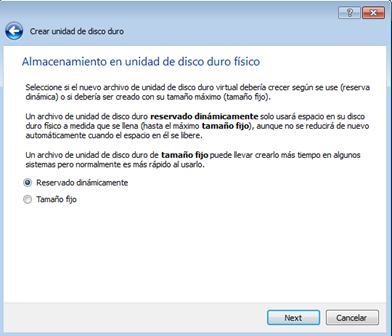 Elige el tipo de disco, y como quieres que sea el almacenamiento, en mi caso voy a seleccionar Reservado Dinámicamente, así solo usara espacio en mi máquina según se vaya llenando el disco virtual: