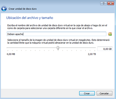Elige la carpeta donde quieres guardar el disco virtual y dale el tamaño que quieras: