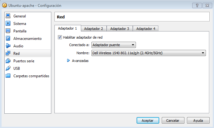 Seleccionamos la máquina y nos vamos a Configuración. En la sección de red nos aseguramos que la máquina está conectada a Adaptador Puente, y en Nombre seleccionamos nuestra tarjeta de red (la de nuestra máquina anfitriona) para asegurarnos de que la máquina virtual usará nuestra tarjeta de red (si estamos conectados a internet, la máquina virtual podrá salir a internet a través de esta tarjeta).