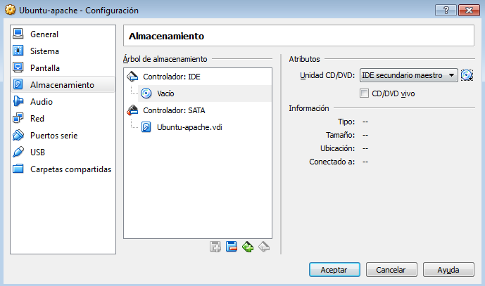 Puedes ver como ahora en lugar de Vacío aparece el nombre del archivo .iso que hemos seleccionado. Y pulsamos Aceptar: