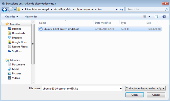 Y seleccionamos la imagen .iso que hemos descargado para instalar Ubuntu (puedes descargar este .iso desde esta dirección https://www.ubuntu.com/download/server).